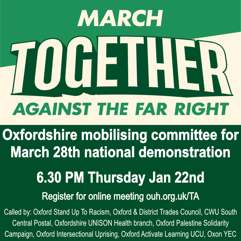 Oxford Stand Up To Racism, Oxford and District TUC, CWU South Central Postal, Oxfordshire UNISON Health branch, Oxford PSC, and Oxford Intersectional Uprising, and the YEC are inviting other organisations to join them in working together to mobilise the biggest number of people from Oxford on 28th March.