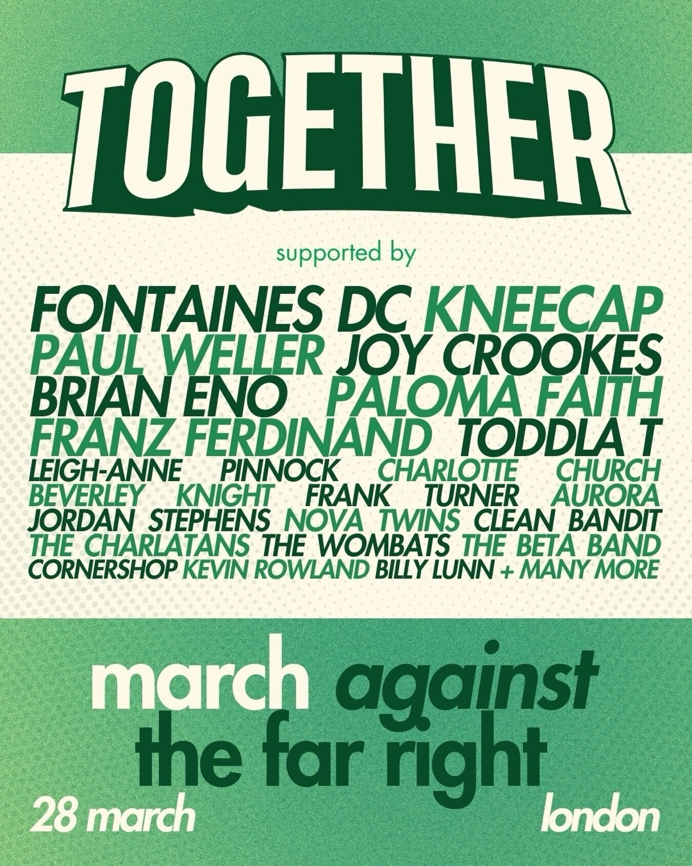 Together is an alliance of over 120 campaigns, organisations and civil society groups alongside thousands of people, united against the division of the far right. Major artists including Fontaines DC, Kneecap and Paloma Faith are supporting the call for us to mobilise.