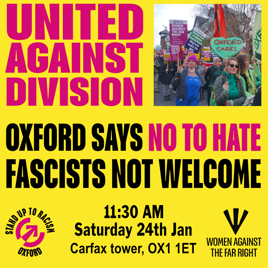 Oxford Stand Up To Racism will be there to challenge their attempts to spread hate - and to build the Together march. Join us if you can.