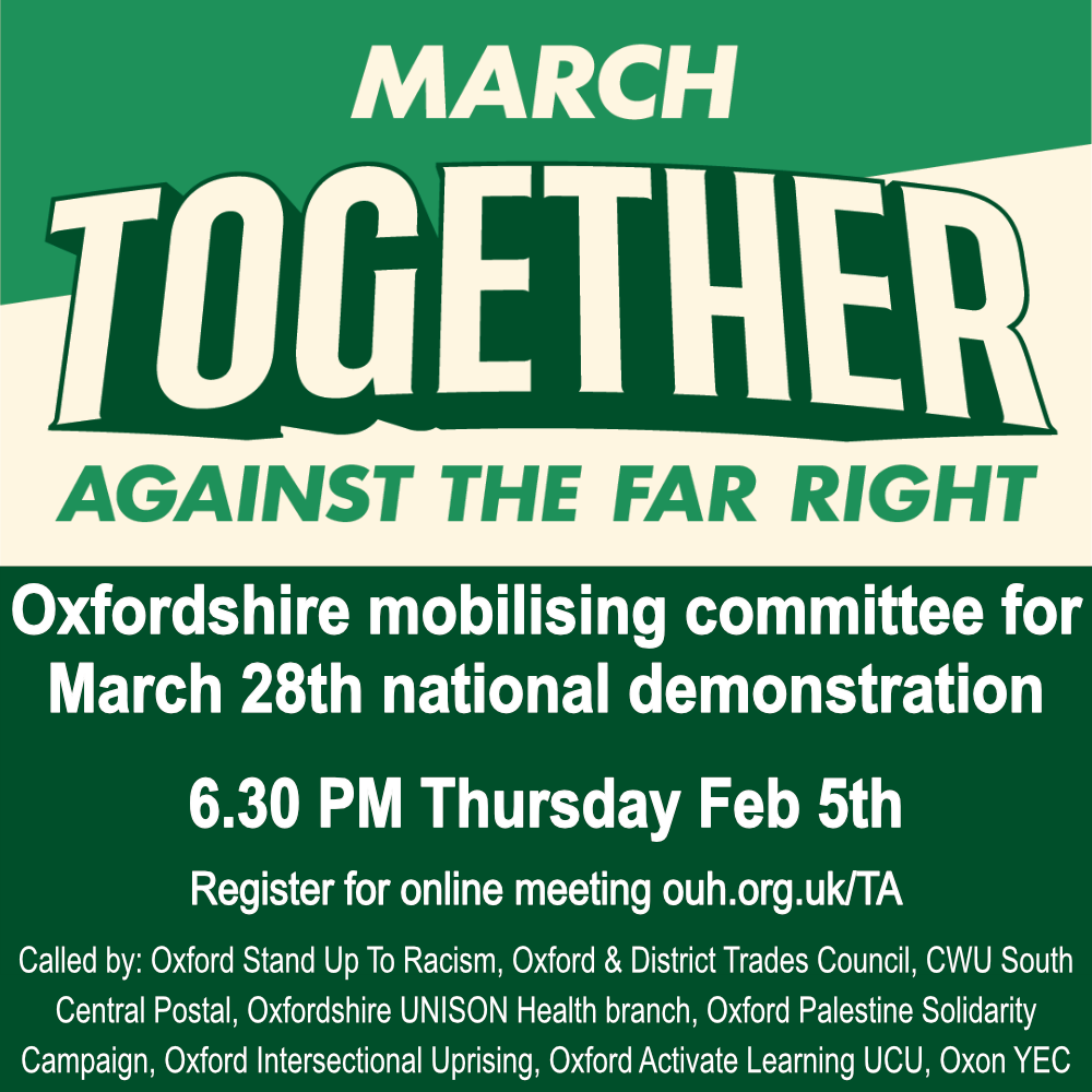 Help us to build the biggest turnout possible from Oxfordshire. Join the online mobilising meeting tomorrow, help for an hour on a street stall, put up posters in your workplace, community or college (flyers/posters available on request from (contact@oxfordstanduptoracism.org.uk)