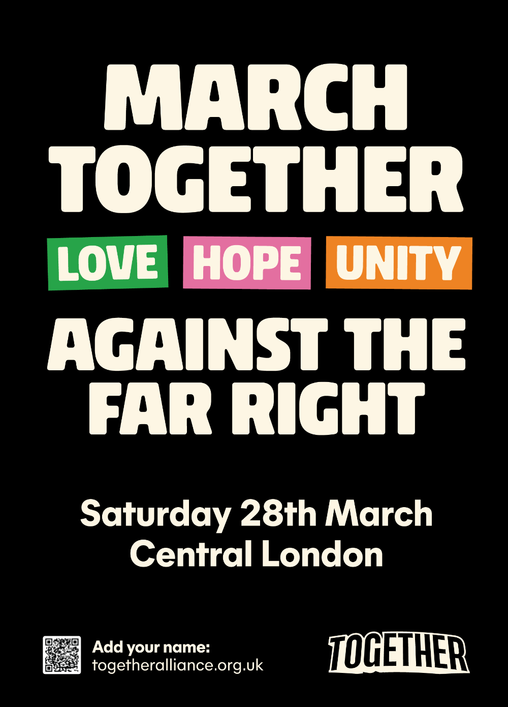 In just 8 weeks time on Saturday 28 March people from all over Britain will be gathering in London for a massive show of strength & unity against the far right called by the Together Alliance.